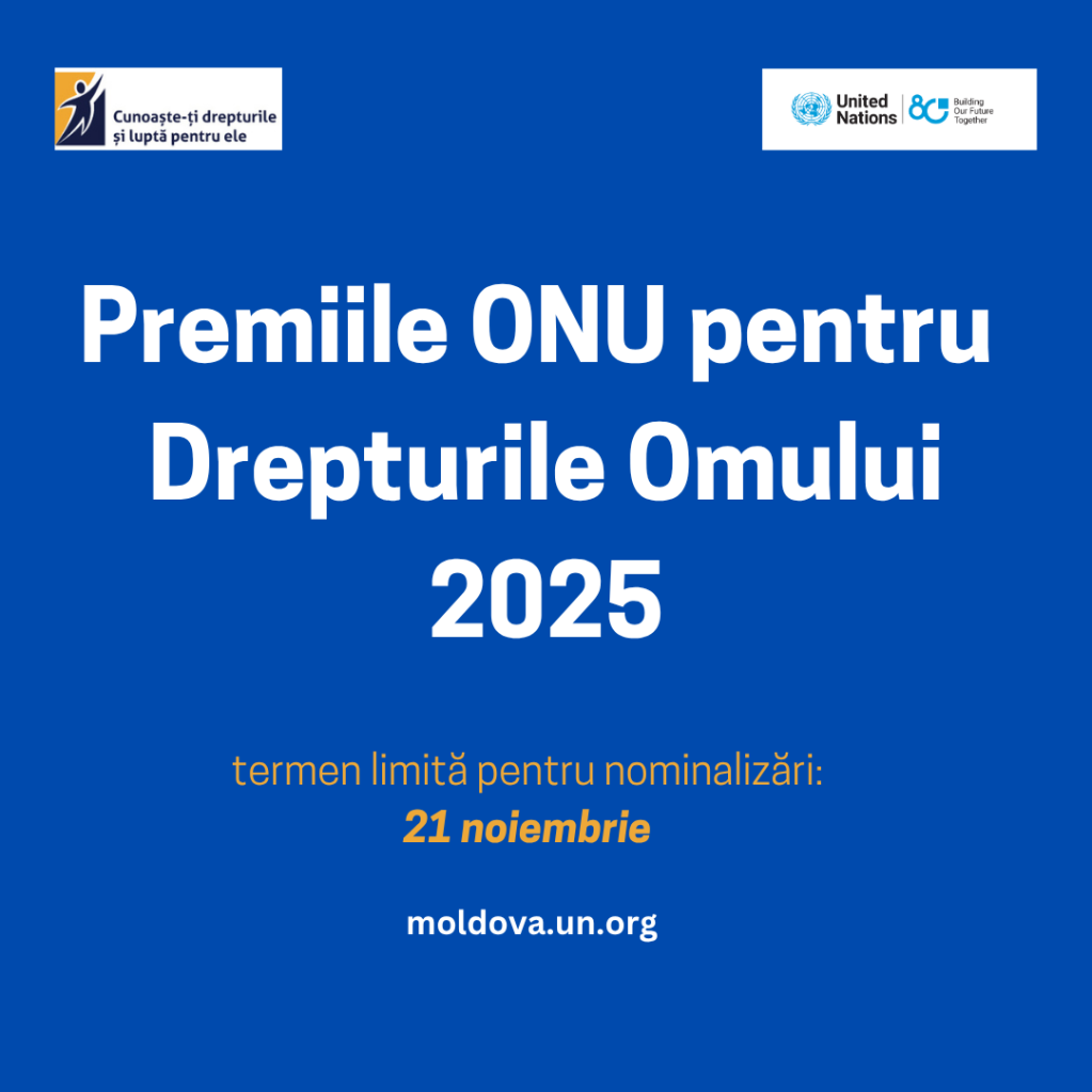 Organizația Națiunilor Unite (ONU) în Republica Moldova lansează cea de-a 19-a ediție a competiției pentru Premiile ONU în domeniul Drepturilor Omului 2025 cu scopul de a recunoaște cele mai valoroase acțiuni de promovare și apărare a drepturilor omului în Republica Moldova.Competiția își propune să evidențieze și să premieze cele mai creative, inovative, eficiente, oportune și participative inițiative și acțiuni de apărare și promovare a drepturilor omului în Republica Moldova de pe ambele maluri ale râului Nistru/Dniester.Competiția din anul 2025 include trei premii, după cum urmează:Premiul general pentru o realizare remarcabilă a drepturilor omului la nivel național și/sau local cu impact direct și durabil asupra titularilor de drepturi;Premiu special pentru realizări remarcabile în domeniul drepturilor omului în protejarea și promovarea drepturilor persoanelor cu dizabilități, în contextul celei de a 15-a aniversări de la ratificare de către Republica Moldova a Convenției ONU privind Drepturile Persoanelor cu Dizabități;Premiu special pentru o realizare remarcabilă la nivel național sau local în protejarea și promovarea drepturilor persoanelor aparținând minorităților etnice, lingvistice sau religioase și persoane refugiate, inclusiv în contextul celei de-a 60-a aniversări a Convenției privind Eliminarea Discriminării Rasiale (CEDR).Nominalizările pentru oricare din premiile menționate mai sus pot fi făcute online: completați aici formularul pentru nominalizări, în limbile română, rusă, engleză sau în altă limbă minoritară prezentă în Republica Moldova (în acest caz se va selecta limba română sau rusă după caz, iar răspunsurile vor fi oferite în limba minoritară). Candidații propuși pot fi persoane fizice sau entități, activitățile cărora au fost întreprinse în perioada Noiembrie 2024 – 21 noiembrie 2025.Sunt acceptate atât nominalizările părților terțe, cât și auto-nominalizările.Nominalizările trebuie să includă următoarea informație:Numele persoanei sau entității nominalizate, inclusiv informația de contact;Numele persoanei sau entității care înregistrează nominalizarea, inclusiv informația de contact;Detalii cu privire la relația între persoana sau entitatea nominalizată și persoana sau entitatea care face nominalizarea;Argumentarea detaliată de ce persoana, organizația sau entitatea nominalizată ar trebui să obțină premiul;Menționarea categoriei pentru care a fost făcută nominalizarea/auto-nominalizare.Pentru mai multe detalii despre procesul de nominalizare, vă rugăm să consultați Regulamentul concursului privind organizarea și desfășurarea concursului pentru cele mai bune acțiuni de promovare și apărare a drepturilor omului pentru decernarea Premiului ONU pentru Drepturile Omului 2025.Formularele de nominalizare pot fi depuse on-line cu confirmarea depunerii nominalizării la adresa de email rco.moldova@un.org. Termenul limită pentru înregistrarea candidaților/candidatelor este 21 noiembrie 2025, ora 18:00.Dosarele persoanelor sau entităților nominalizate, obținute în urma apelului public, precum și în urma analizei altor materiale disponibile, vor fi jurizate de un consiliul independent, format din reprezentanți/-te ai organizațiilor și misiunilor internaționale și experți /-te independenți.Rezultatele competiției pentru drepturile omului 2025 vor fi anunțate în cadrul unui eveniment dedicat, pe 10 decembrie, în Ziua Internațională Drepturilor Omului.***Versiunea în limba rusă a comunicatului de presă AICI Русская версия пресс-релиза ЗДЕСЬ